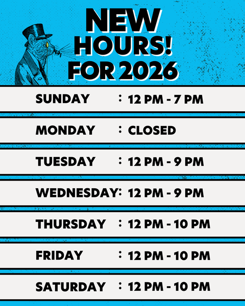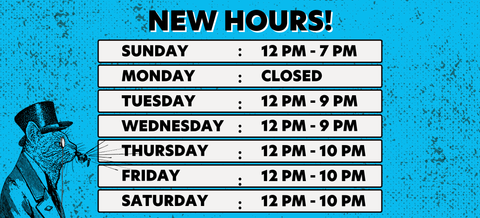 STORE HOURSMon-Wed: 4PM - 9PMThu: 4PM - 10PMFri: 2PM - 11PMSat: 11AM - 11PMSun: 11AM - 7PM