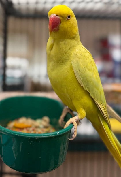 Crouton is a beautiful Lutino (lacewing) Indian Ringneck Parakeet with a bright personality and a love for dancing and snacking. After being found as a stray with no owner coming forward, she’s now looking for a calm, bird-savvy home where she can truly thrive. Crouton can be nervous in busy environments, so she currently enjoys a quieter space where her sweet and curious nature shines.